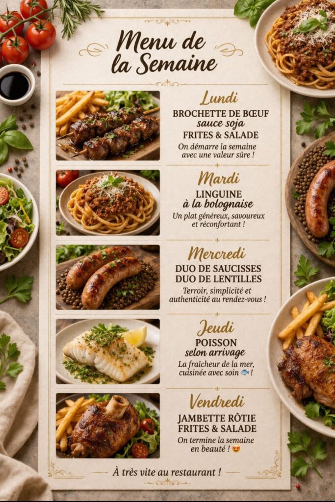 Au menu, il y en a pour tous les goûts.. Poissons et viandes finement cuisinés en accord avec les saveurs et les parfums de produits de saison